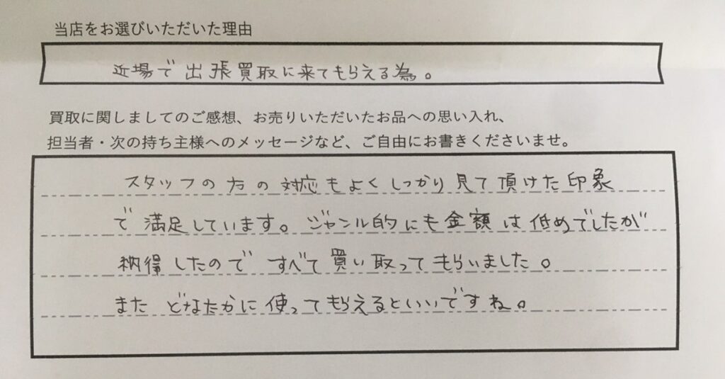 出張査定はおおむね100枚で30分〜1時間程度です。