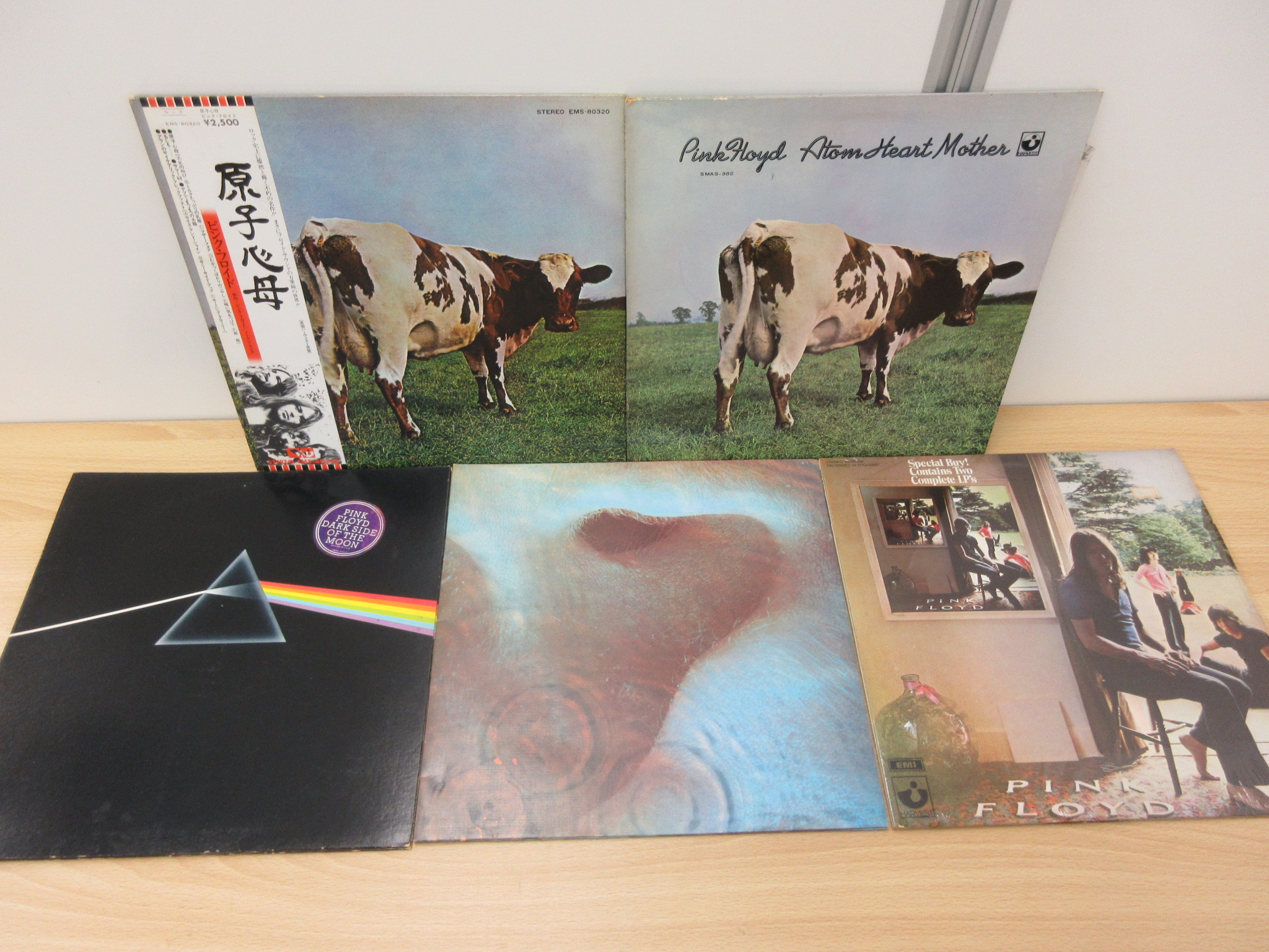 ざっと目算でLPが200枚程度、といったところです。端から見ていくと、ピンク・フロイドが結構出てきます。上段の原子心母は、左が国内盤、右がUS盤です。オリジナルと違ってタイトルが印刷されていますね。牛の写真だけで文字がないのがこのジャケットのインパクトのあることなのに、余計なことをしてくれるものです。中央の段、「狂気」と「ウマグマ」はUS盤、そして中央「おせっかい」はUK盤でした。