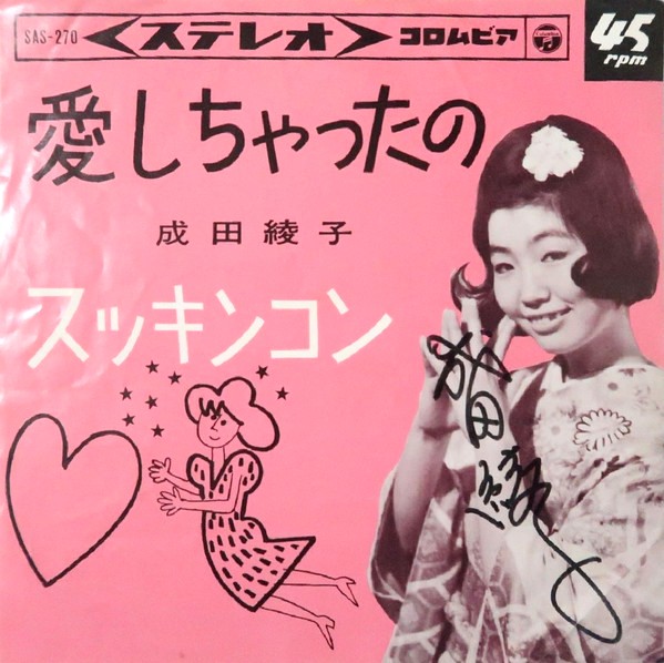 浜口庫之助・作詞作曲の大ヒット曲「愛しちゃったの」のシングル。和田弘とマヒナスターズ&田代美代子のバージョンが有名ですが、こちらは成田綾子によるカバー(または競作)盤です。愛らしい歌声と、昭和歌謡ならではの親しみやすいメロディが、当時の大衆の心を掴みました。