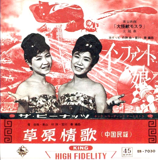 映画『モスラ』(1961年)の劇中歌。小美人(ザ・ピーナッツ)が怪獣モスラを呼び寄せるために歌う、神秘的でエキゾチックな名曲です。架空の言語(インドネシア語などをベースにしたものと言われる)で歌われるこの曲は、特撮ファンのみならず、多くの人々の記憶に刻まれています。B面は「草原情歌」。