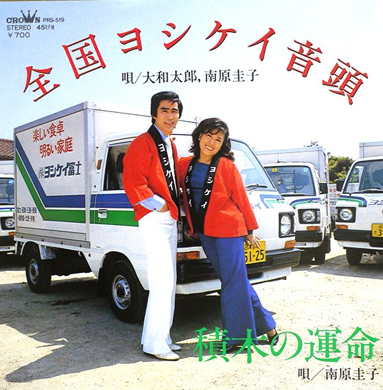 食材宅配サービスでお馴染み「ヨシケイ」の企業音頭レコード。委託制作盤(PRS規格)です。作詞・作曲を含め、企業のPRや社内の結束を高めるために制作されたものでしょう。「全国ヨシケイ音頭」という直球なタイトルが、昭和の企業文化のエネルギーを感じさせます。一般のレコード店には並ばなかった非売品・配布品の類です。
