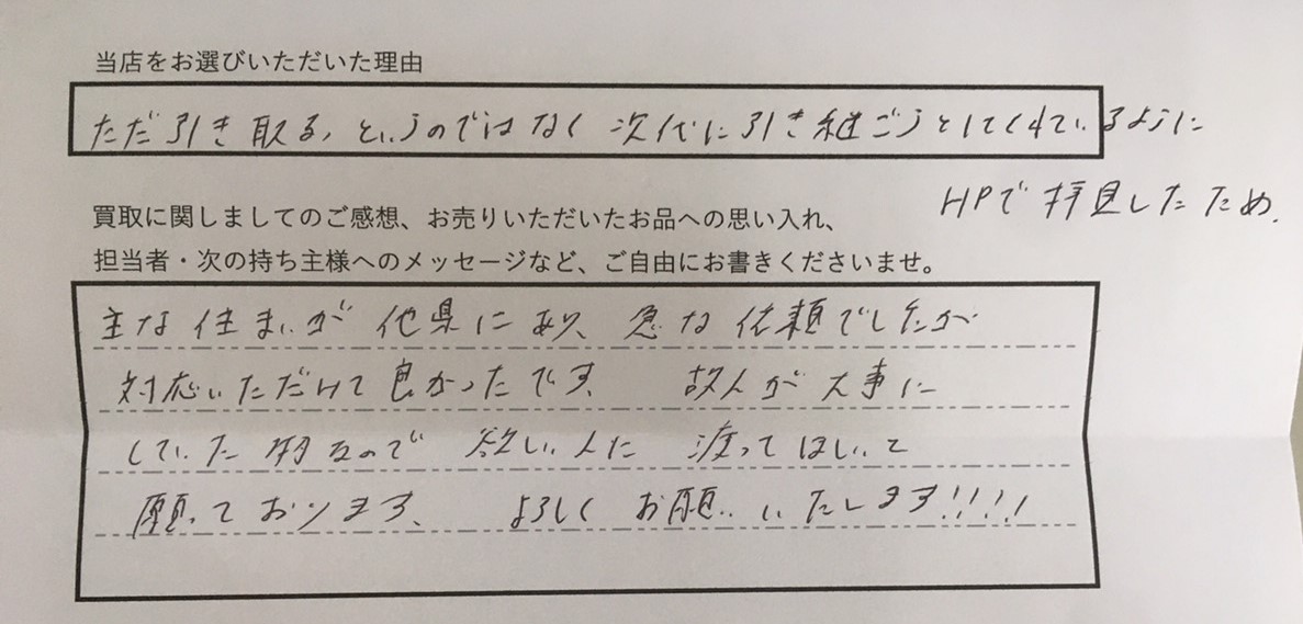 “主な住まいが他県にあり、急な依頼でしたが対応いただけて良かったです。故人が大事にしていた物なので、欲しい人に渡ってほしいと願っております。よろしくお願いいたします!!!!”