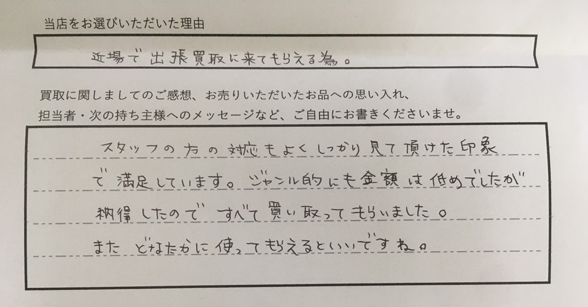 “スタッフの方の対応もよくしっかり見ていただけた印象で満足しています。ジャンル的にも金額は低めでしたが納得したのですべて買い取ってもらいました。またどなたかに使ってもらえるといいですね。”